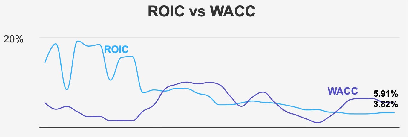 Capital efficiency remains the more pressing concern. Current ROIC of 3.82% trails WACC of 5.91%. Over the past five years, the median ROIC was 3.63%, while median WACC stood at 6.62%. Even at its ten-year peak of 5.49%, ROIC has struggled to consistently exceed capital costs. The ten-year low of 3.57% highlights how narrow the improvement band has been.