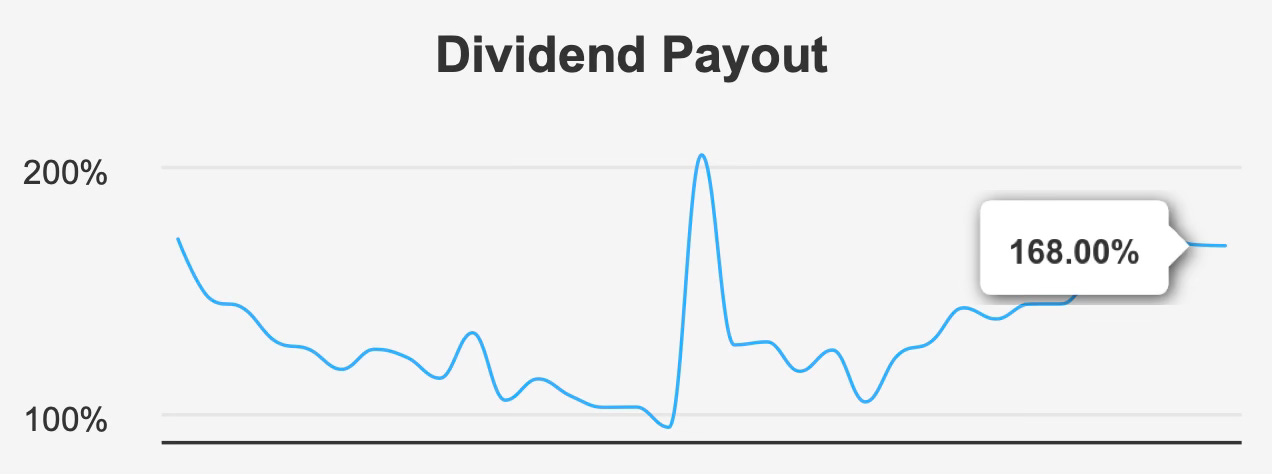 The more material issue is payout sustainability. The current dividend payout ratio is 168.0%, well above the ten-year median of approximately 101.4%. Dividend coverage stands at 0.57, indicating distributions materially exceed earnings. While REIT accounting often differs from traditional payout calculations, the elevated ratio nevertheless constrains flexibility.