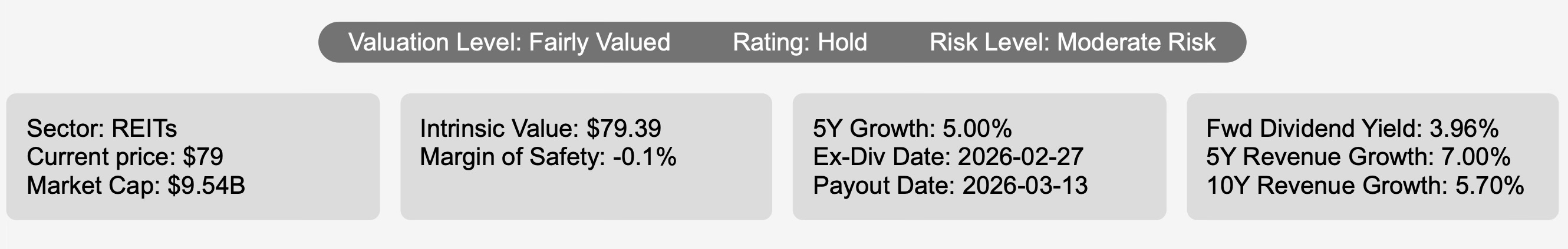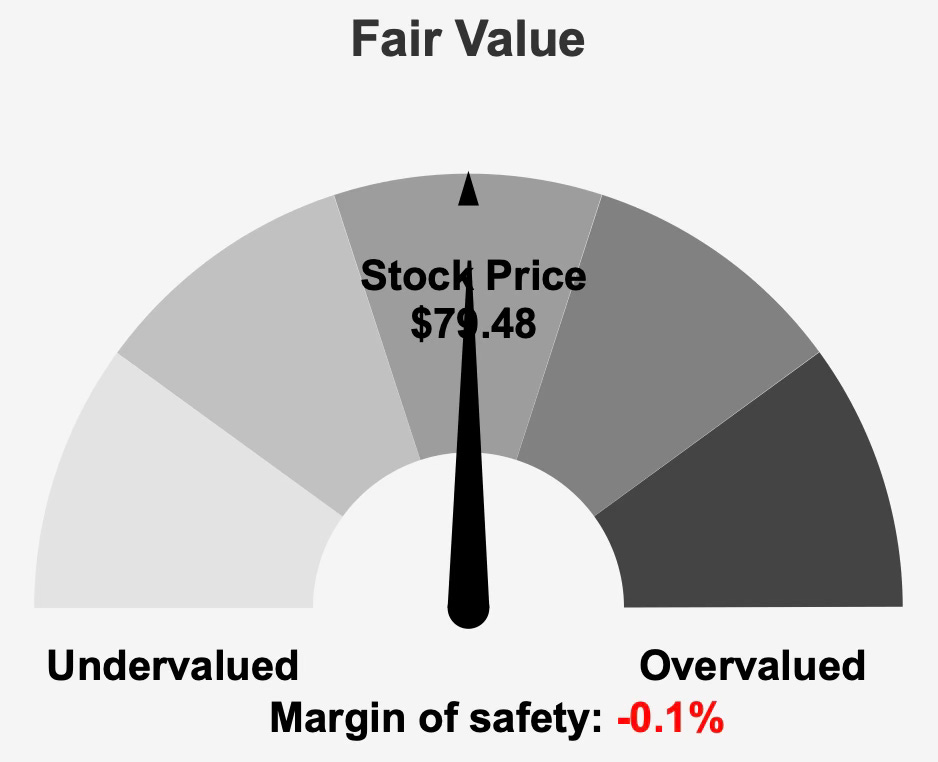 Agree Realty Corporation ADC 0.00%↑ operates as a fully integrated retail-focused net-lease REIT, owning, acquiring, developing, and managing properties leased to industry tenants including Walmart, 7-Eleven, Wawa, and Gerber Collision. With a market capitalization of $9.54 billion and a current share price of $79, the stock trades almost exactly at its calculated intrinsic value of $79.39, leaving a margin of safety of -0.1%.
