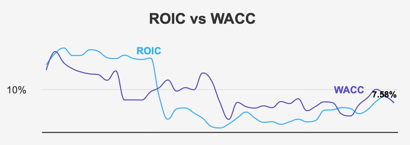 From a capital efficiency standpoint, the picture is more nuanced. The five-year median return on invested capital stands at 6.6%, with the current figure at 7.6%. While this marks improvement, it remains slightly below the five-year median weighted average cost of capital of 8.5%. The current WACC of 7.7% narrows that gap considerably, suggesting marginal economic value creation in the most recent period.