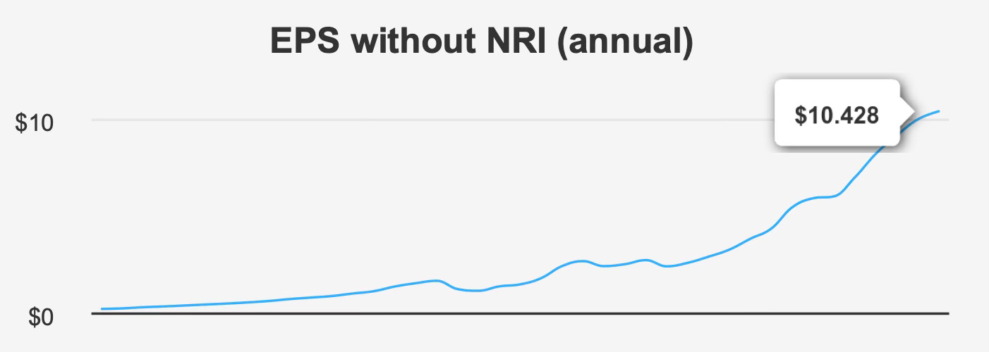Over the past five years, EPS has compounded at 12.3% annually, with a 10-year CAGR of 13.3%. That consistency underscores the structural strength of ADP’s recurring revenue model and its ability to convert client retention into durable profit growth. Revenue has expanded at a 5-year CAGR of 8.8% and a 10-year CAGR of 7.9%, indicating steady but not explosive growth—precisely the profile one expects from a mature, scaled platform business.