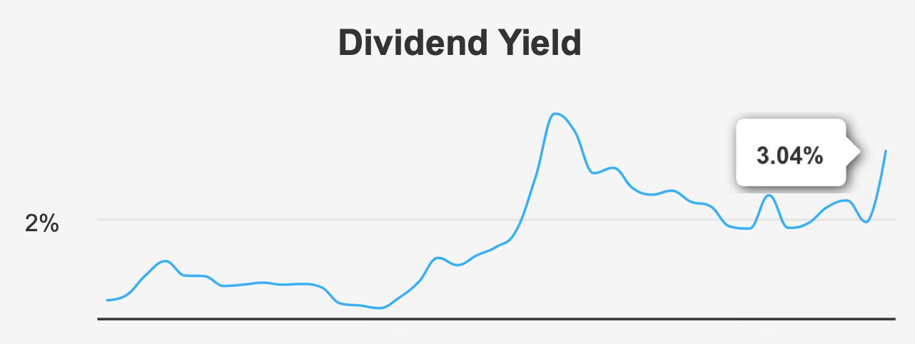 At current levels, the forward dividend yield of 3.04% sits near a 10-year high and materially above the historical median yield of 2.0%. That elevated yield provides income investors with a more attractive entry point compared with prior valuation peaks.