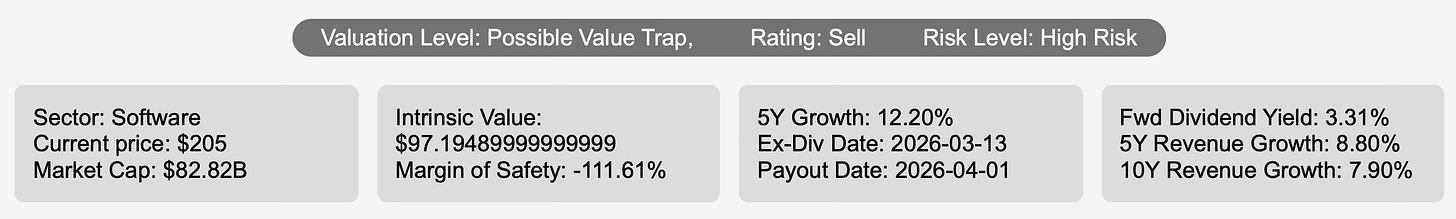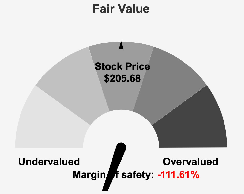 However, at $205 per share against an intrinsic value of $97, the absence of margin of safety overshadows operational strength. Even though several valuation multiples sit near historical lows, they do not reconcile the intrinsic valuation gap.