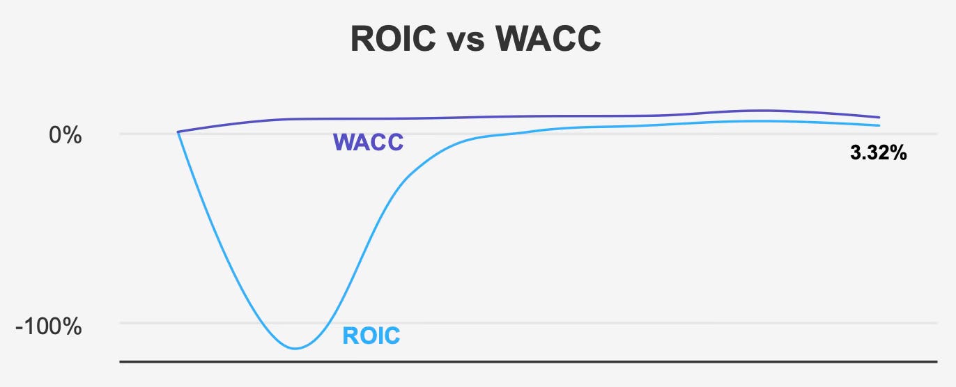 The central issue is not revenue growth, which has been strong, but rather the inability to convert that growth into durable economic returns. Return on invested capital currently stands at 3.3%, materially below the 7.6% weighted average cost of capital. When a company consistently earns below its cost of capital, it destroys value rather than creates it. That dynamic frames the investment debate.