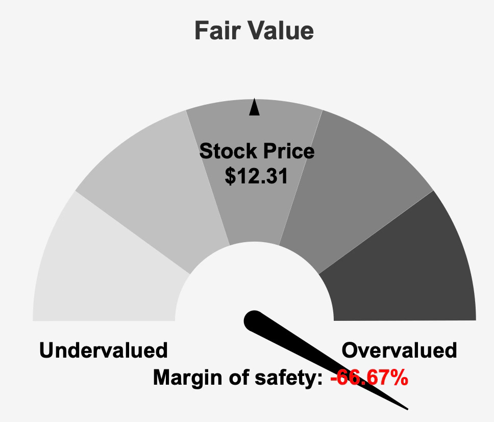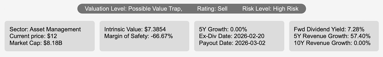 Yet scale alone does not translate into shareholder value creation. The stock currently trades at $12 against an intrinsic value of $7.39, implying a negative margin of safety of -66.6%. The firm is formally categorized as a possible value trap with a Sell rating and High Risk designation. This classification reflects not only valuation concerns but also weak economic profitability and balance sheet pressures.