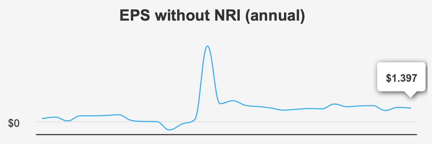 Longer-term trends remain mixed. Over the past five years, annual EPS excluding non-recurring items declined at a compound rate of 3.4%, reflecting earlier earnings pressure. Over ten years, EPS growth has been modest at 1.7% annually. The contrast between recent quarterly acceleration and subdued longer-term compounding underscores the importance of confirming that current gains are sustainable.