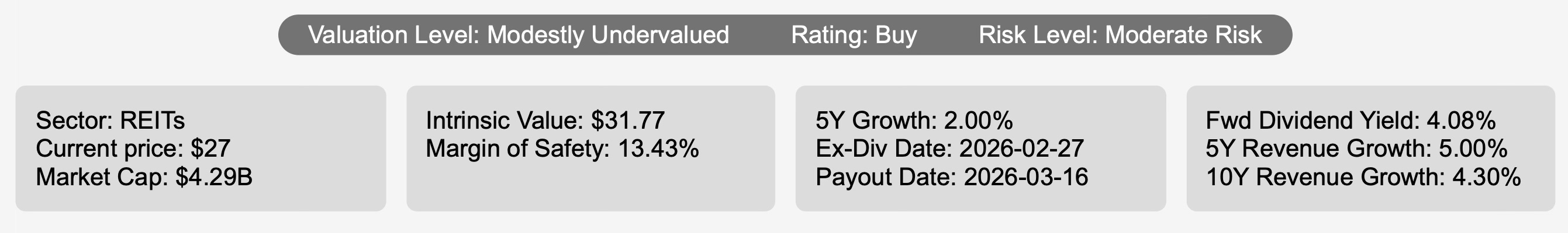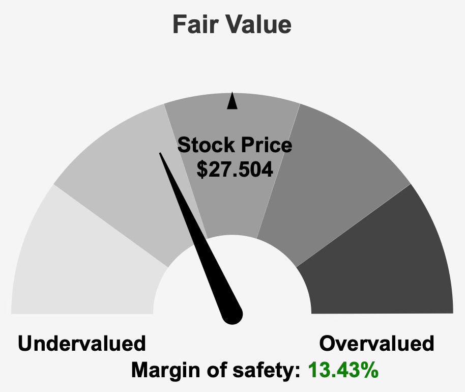 At a current share price of $27 and a market capitalization of $4.29 billion, the trust trades below its estimated intrinsic value of $31.77. This implies a margin of safety of 13.4%, positioning the equity as modestly undervalued on an intrinsic basis. The forward dividend yield of 4.1% adds income appeal, particularly within the REIT sector.