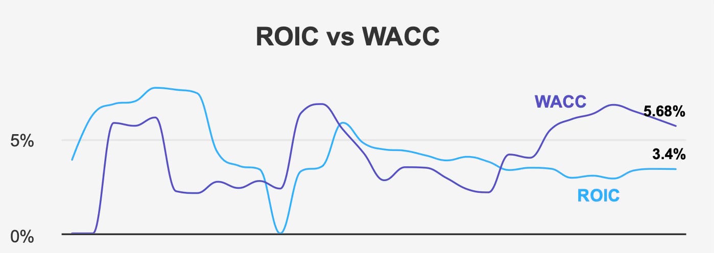 However, valuation support alone does not define the investment case. Returns on invested capital have consistently trailed the cost of capital. Recent ROIC stands at 3.4%, below the five-year median WACC of 6.3% and also below the current WACC of 5.7%. Although the spread has narrowed as WACC declined, economic value creation remains negative.