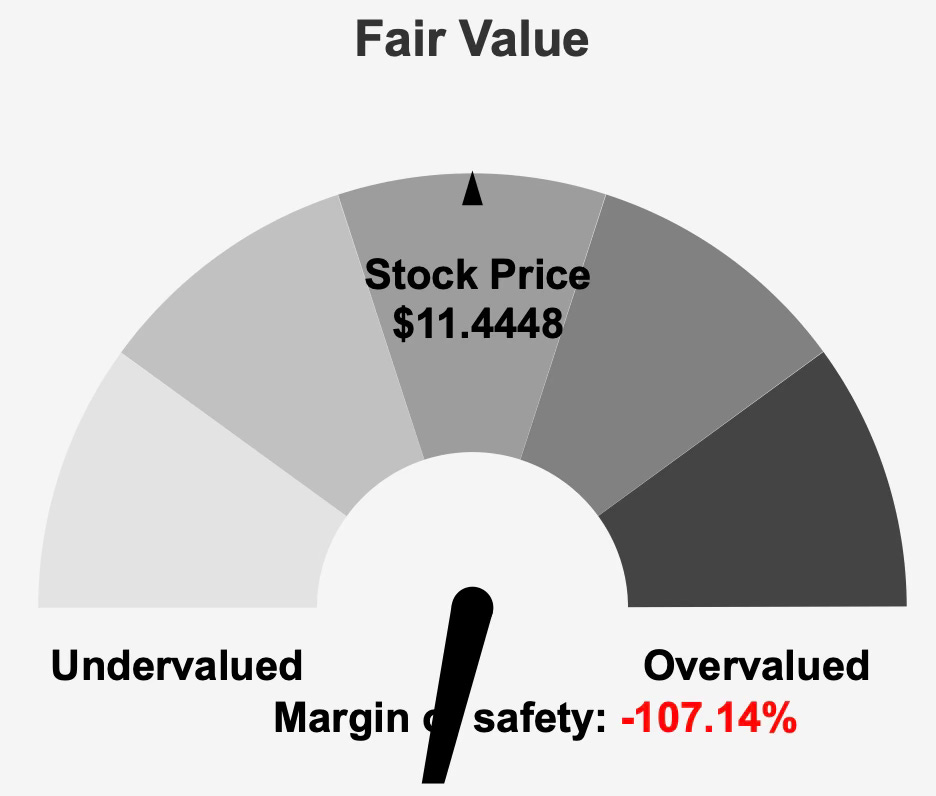 Intrinsic value estimates place fair value at approximately $5.53 per share, significantly below the current market price of roughly $11.44. This implies the shares trade at more than double their estimated intrinsic value, resulting in a negative margin of safety of about 107%.
