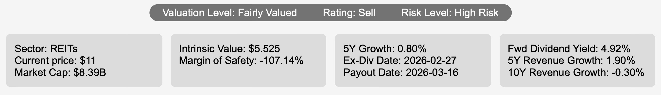 For dividend investors, the forward yield of approximately 4.9% provides moderate income generation, particularly given the REIT’s monthly dividend structure. Nonetheless, the modest growth trajectory, combined with weak capital returns and high leverage, suggests that the trust’s income profile may come with elevated financial risk.