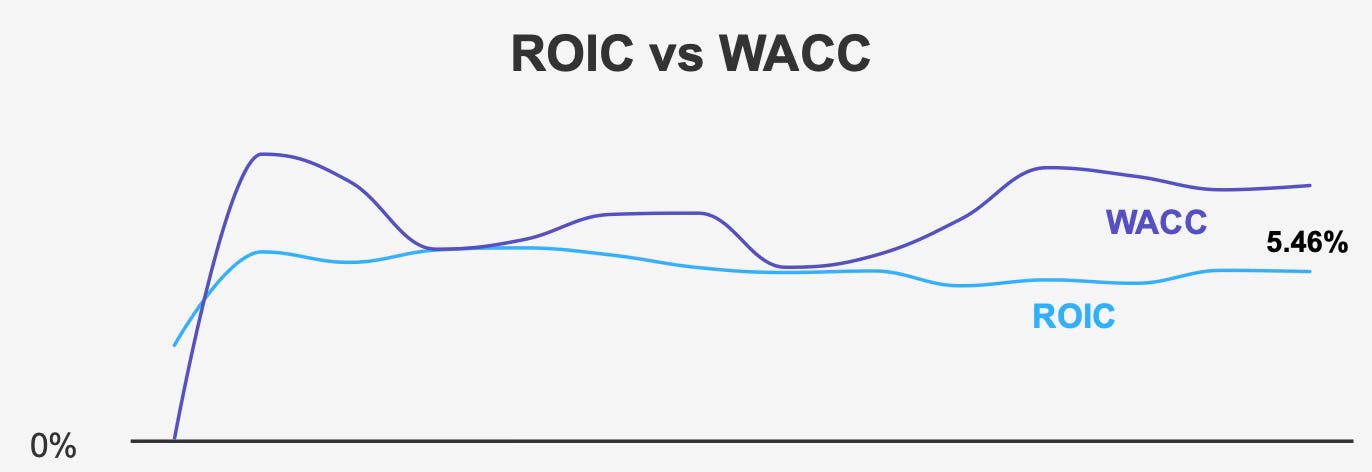 When a company consistently earns returns below its cost of capital, it effectively destroys shareholder value rather than creating it. This gap between ROIC and WACC has persisted over time, indicating structural inefficiencies in capital deployment.