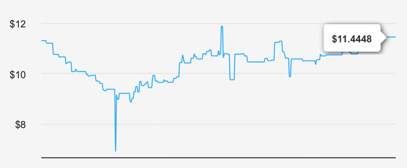 At the current market price near $11, the trust carries a market capitalization of approximately $8.39 billion. Yet fundamental valuation models estimate intrinsic value closer to $5.53, implying the shares trade well above underlying economic value. The resulting negative margin of safety of roughly 107% highlights a disconnect between market pricing and fundamental valuation metrics.