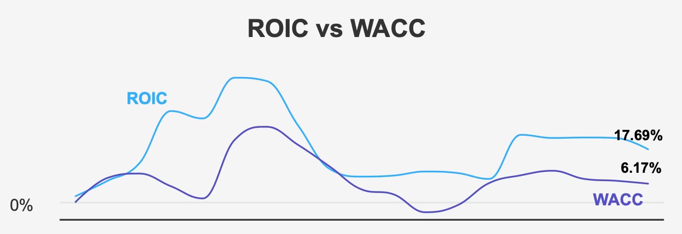 Even in the most recent period, capital efficiency remains strong. Return on invested capital currently stands at 17.8%, comfortably above the current WACC of 6.2%. Although slightly below the five-year median, the persistence of this positive spread suggests that management continues to allocate capital effectively.