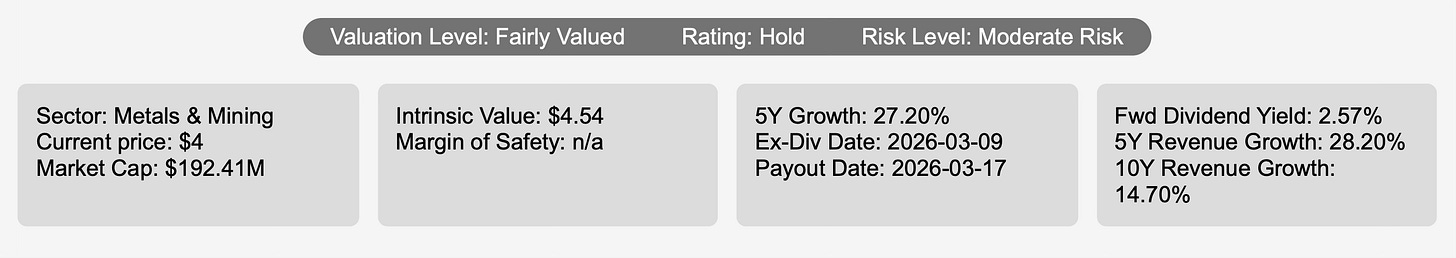 However, despite these attractive characteristics, the investment case is tempered by the company’s current valuation. Dynacor’s intrinsic value estimate is approximately $4.54 per share, while the stock trades around $4, implying that the shares sit close to fair value with little margin of safety. Investors therefore face a trade-off between strong operational fundamentals and a valuation that already reflects much of the company’s recent success.