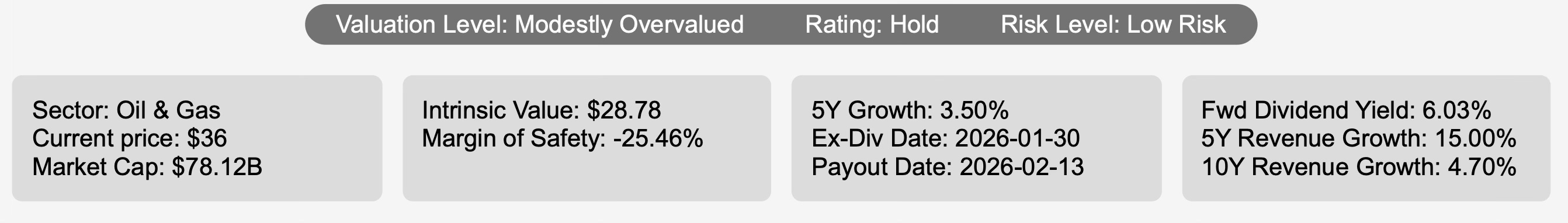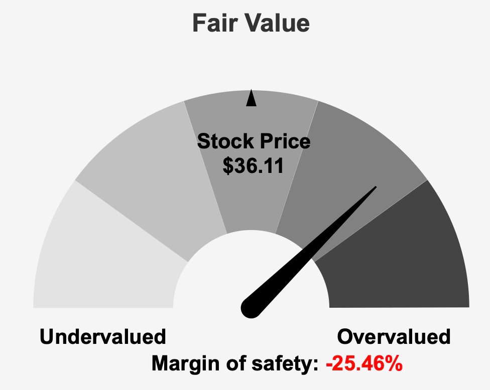 Enterprise Products trades above its intrinsic value estimate of $28.78 at a market price around $36, implying a negative margin of safety near 25%. Investors are effectively paying upfront for perceived reliability.