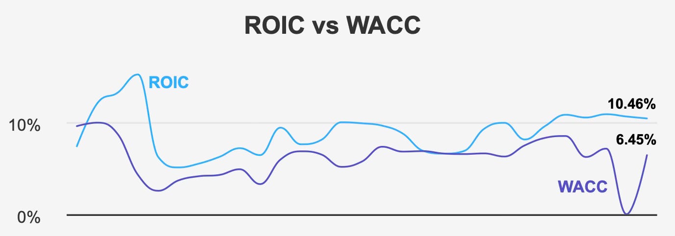 The most important indicator of long-term durability is economic profitability. Enterprise Products produces a return on invested capital near 10.5%, comfortably exceeding its cost of capital around 6.5%. Over five years the spread has persisted, demonstrating that new projects generate value rather than merely sustaining volumes.