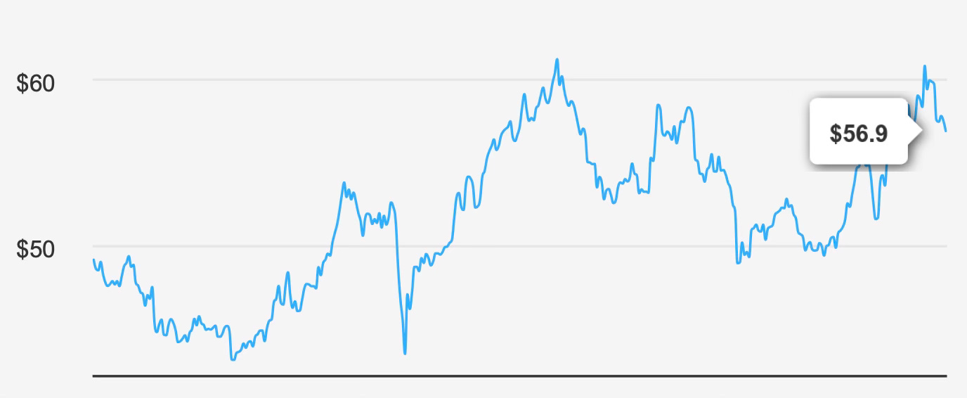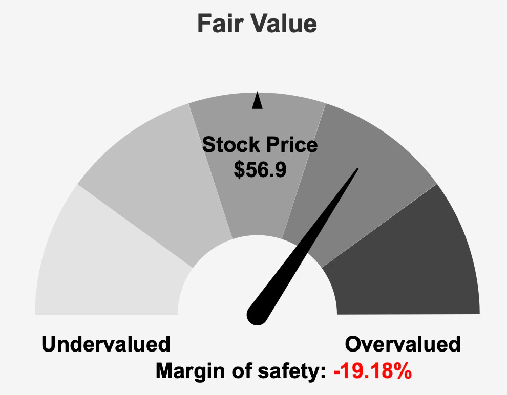 The company’s intrinsic value is estimated at approximately $47.74 per share, while the market price currently sits near $56. This difference implies a negative margin of safety of roughly 19.2%. In valuation terms, that gap indicates that the market is assigning a premium to the company’s shares relative to modeled fair value.
