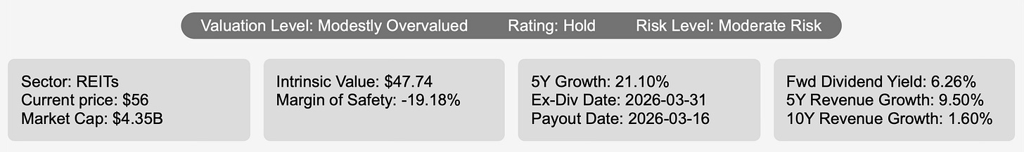 At present, the company commands a market capitalization of approximately $4.35 billion and trades near $56 per share. The stock offers a forward dividend yield of roughly 6.3%, positioning it among the higher-yielding REITs in the public market. For income-focused investors, that level of yield is immediately attractive, particularly when supported by relatively stable real estate cash flows and long-term lease structures.