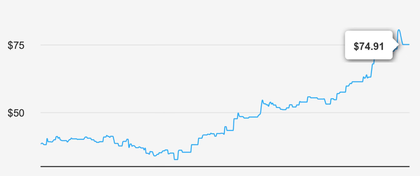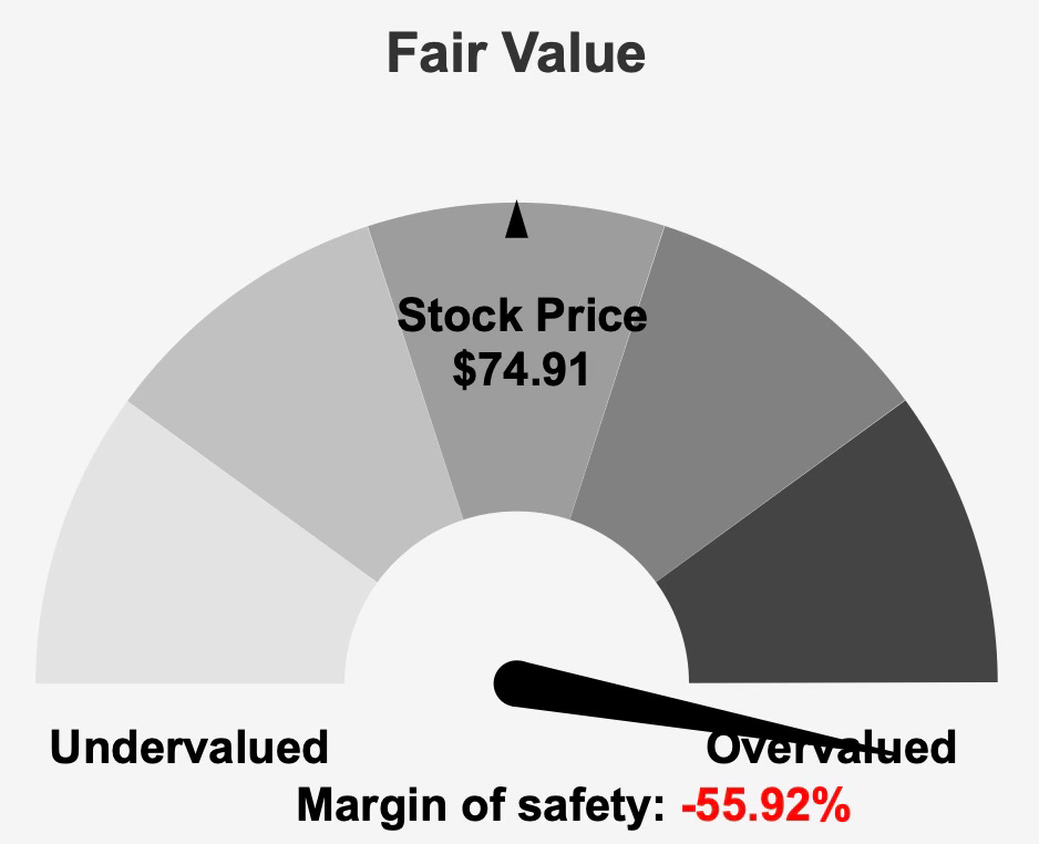 Based on fundamental valuation models, intrinsic value is estimated around $48 per share, significantly below the current market price of roughly $74. This gap implies a negative margin of safety of about 56%, meaning investors are paying a substantial premium relative to estimated fair value.