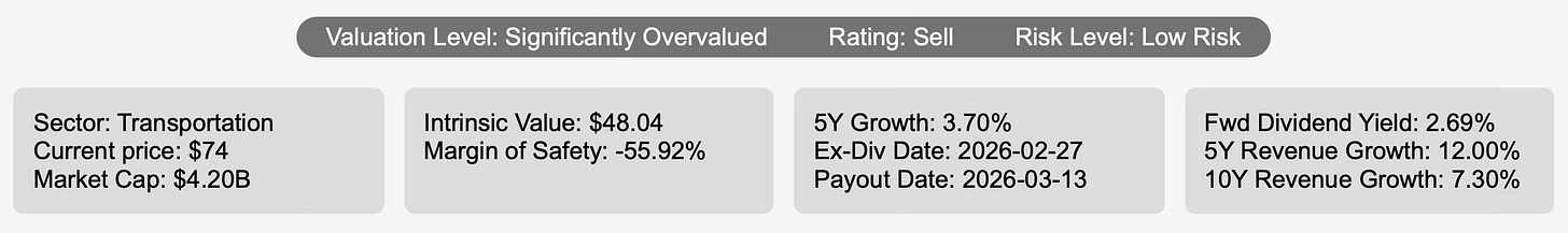 At a share price near $74, the company carries a market capitalization of roughly $4.2 billion. Despite a business model built on stable cash-generating operations, the current valuation appears disconnected from its underlying fundamentals. Estimated intrinsic value stands around $48 per share, implying a negative margin of safety of roughly 56%. In practical terms, this means the market currently prices the stock far above its estimated fair value.