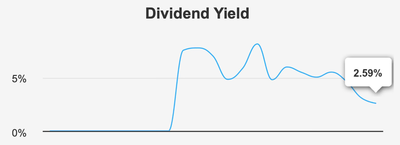 The company currently offers a forward dividend yield of roughly 2.6%. While respectable relative to broader equity markets, this yield is significantly below the company’s historical norms. Over the past decade, the median dividend yield has been approximately 5.5%, suggesting the current yield compression largely reflects rising share prices rather than rapidly growing dividend payments.
