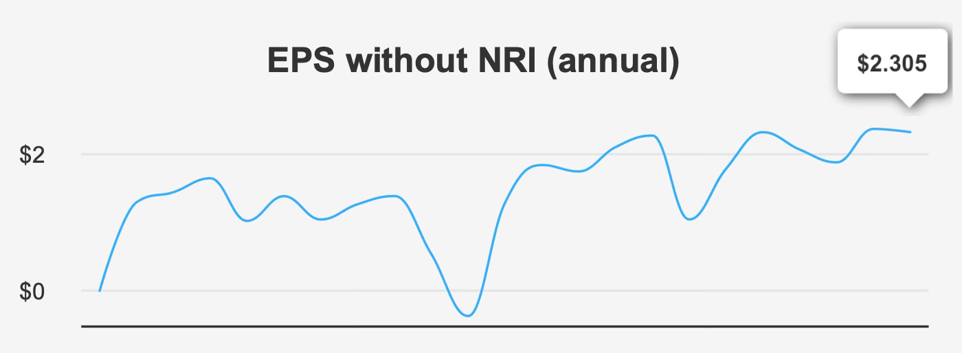 Operationally, the company has demonstrated steady revenue expansion. Revenue has grown at approximately 12% annually over the past five years and about 7.3% over the past decade. Earnings growth has been somewhat more volatile but still respectable. Over the last five years, annual earnings per share excluding non-recurring items have increased at roughly a 15% compound rate, though the longer ten-year growth rate slows to around 3.8%.