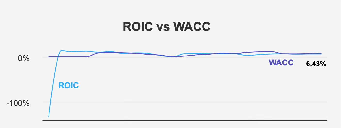 This gap indicates that the company has historically struggled to consistently generate economic value above its cost of capital. When return on invested capital falls below the cost of capital, growth can actually erode shareholder value despite rising revenues and earnings.