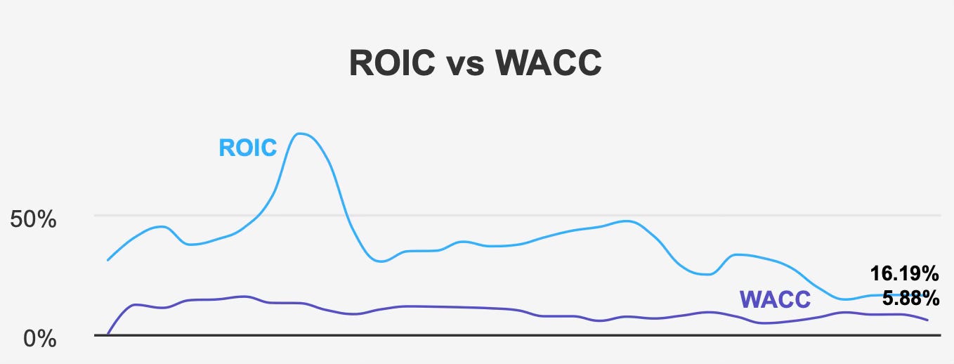 Profitability metrics remain particularly compelling. Over the past five years, median return on invested capital has been 16.5%, comfortably above the median weighted average cost of capital of 8.2%. In the most recent reading, ROIC stands at 16.2% against a WACC of 5.9%. This sustained spread indicates durable economic value creation and disciplined capital deployment.