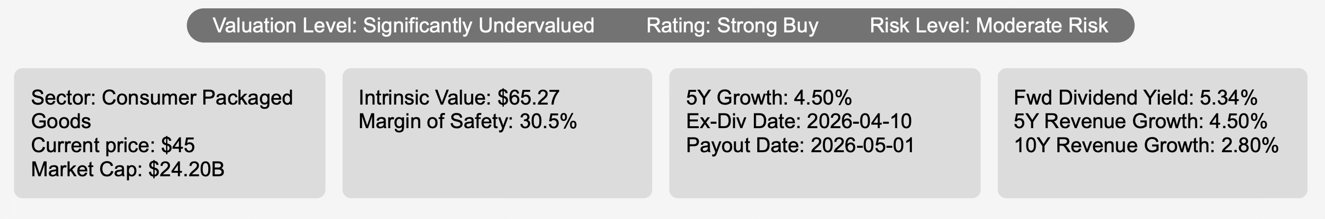 General Mills GIS 0.00%↑ currently represents a rare combination in the consumer staples sector: stable operating economics, a well-covered dividend yield above 5%, and a valuation materially below both intrinsic value and long-term trading norms. At roughly $45 per share against an estimated intrinsic value of $65.27, the equity trades with a margin of safety of about 30.5%, placing it firmly in deep value territory for a defensive branded food company.