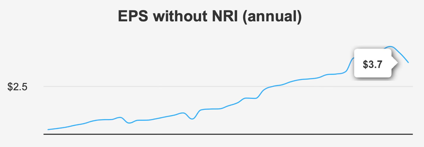 The investment case does not depend on rapid expansion. Instead, it rests on resilience — slow but persistent earnings growth, consistent capital returns, and the ability to generate returns above the company’s cost of capital across cycles. Over the past five years, earnings without non-recurring items grew at a compound rate of 2.7% and approximately 5.0% over ten years, reflecting a mature but durable earnings engine rather than a growth narrative.