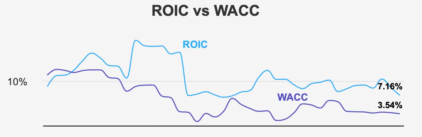 Importantly, economic profitability remains intact. The company’s five-year median return on invested capital of 9.02% comfortably exceeds its weighted average cost of capital of 3.84%. Even the current ROIC of 7.16% remains well above the 3.54% cost of capital. This persistent positive spread confirms that capital deployment continues to create value despite slower growth.