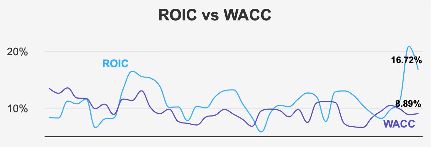 The most compelling evidence of value creation lies in capital efficiency. The current ROIC of 16.7% meaningfully exceeds the 8.9% weighted average cost of capital. Even on a median basis, five-year ROIC of 9.6% surpasses the five-year median WACC of 9.4%, indicating consistent economic profit generation. Over the past decade, ROIC reached a high of 20.8%, compared with a 10-year median WACC of 9.1%, underscoring sustained spread generation across cycles.