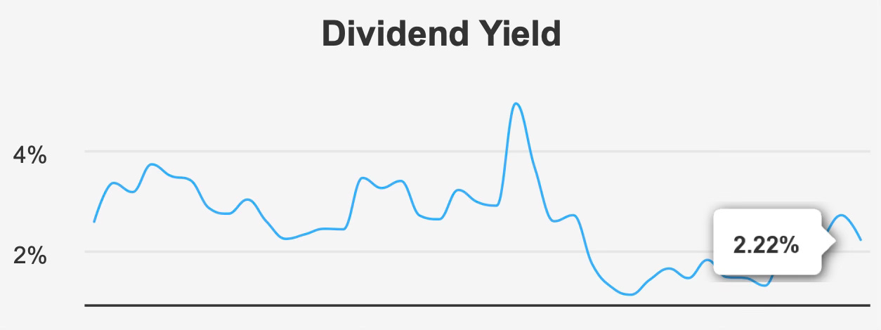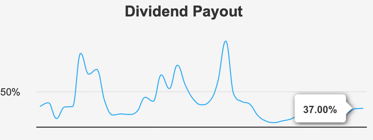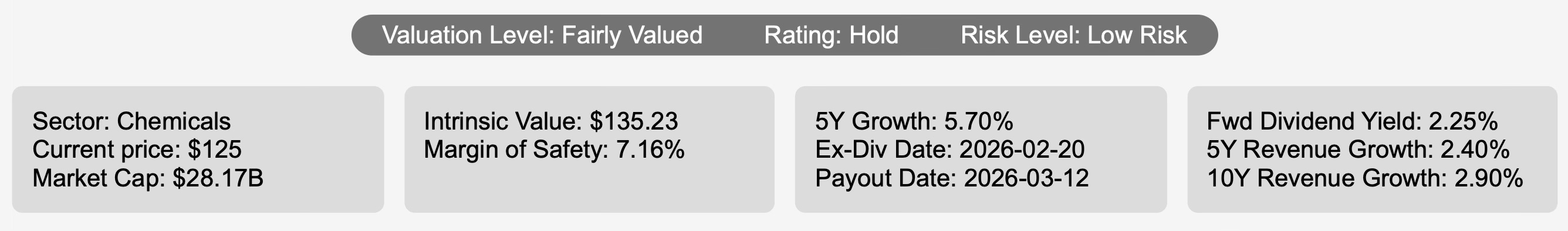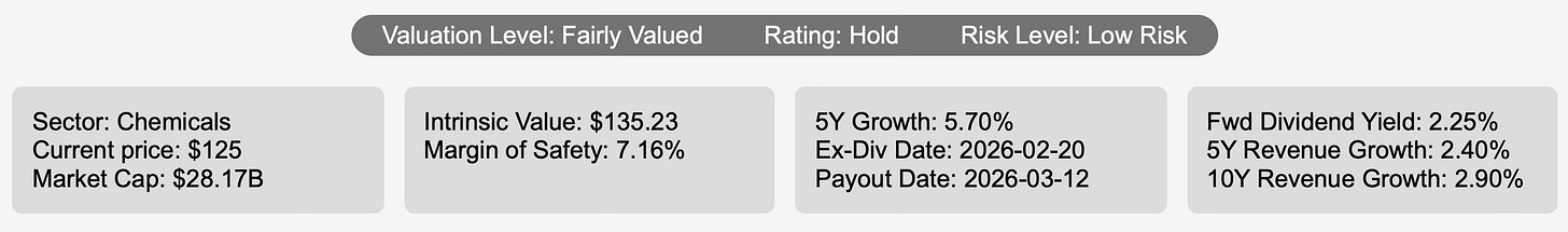 The forward dividend yield stands at 2.22%, competitive within the chemicals sector, though below the 10-year high of 2.86%. The payout ratio of 37.0% remains conservative, providing flexibility for continued increases even in periods of moderate earnings pressure. Dividend coverage stands at 2.5x, reinforcing the margin of safety embedded in the distribution.