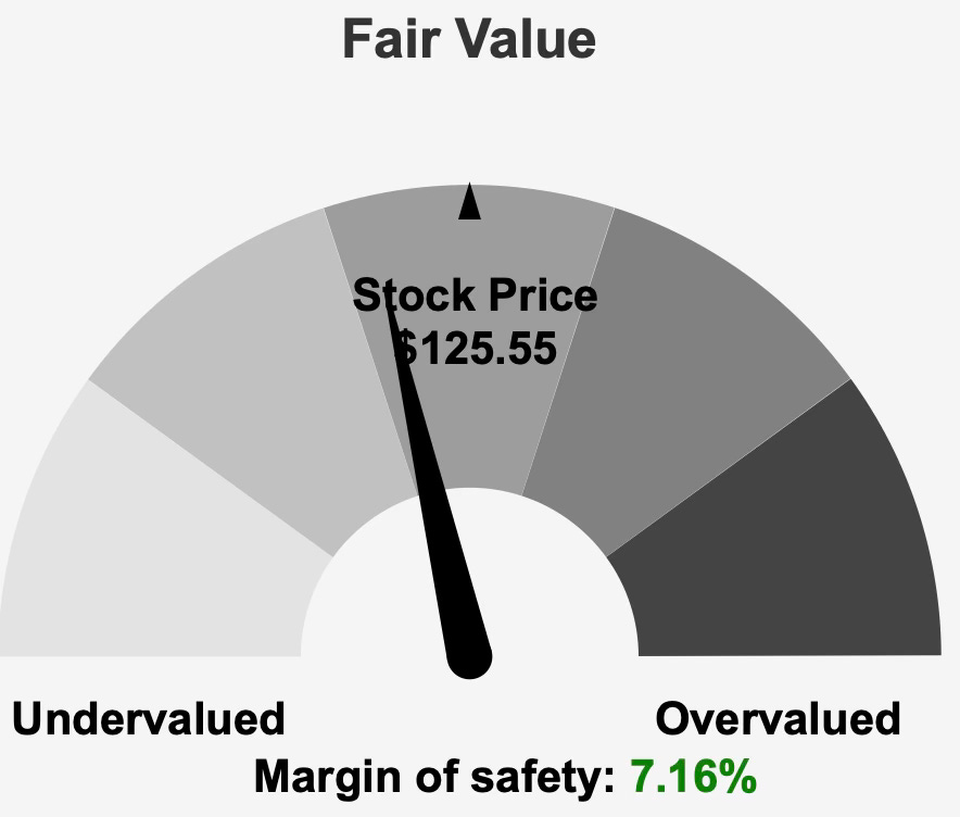 At a current share price of $125 and a market capitalization of $28.17 billion, the stock trades modestly below its intrinsic value estimate of $135.23, implying a 7.2% margin of safety. While not deeply discounted, the valuation suggests reasonable entry conditions for long-term investors seeking stable dividend growth anchored by durable competitive positioning.