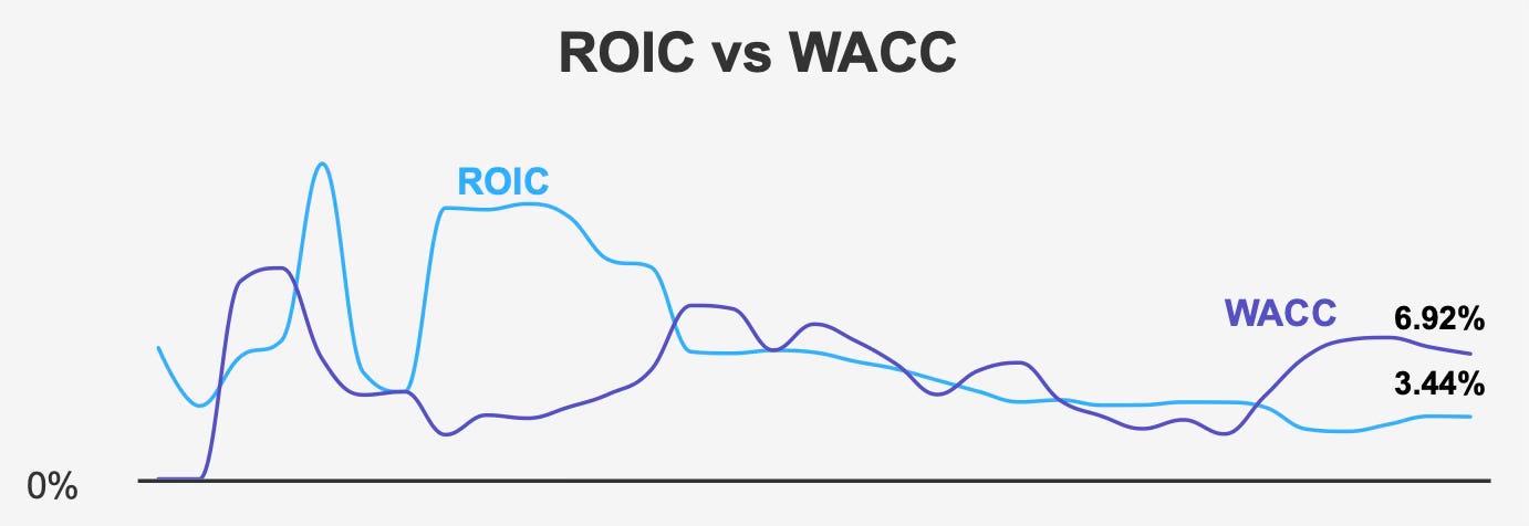 The central tension in the investment case lies in capital efficiency. Realty Income generates returns on invested capital near 3.4% while its cost of capital approaches 6.9%. Over time, this gap limits the rate at which intrinsic value can grow even as the asset base expands. The company can become larger without becoming materially more profitable on a per-dollar basis.