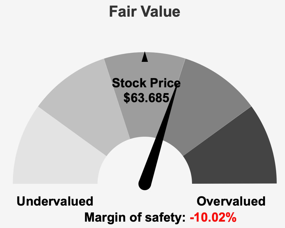 At approximately $63 per share versus intrinsic value near $57.88, the stock trades modestly above fair value, implying a margin of safety around negative 10.0%. The market is effectively pricing stability at a premium. Investors buying today are not purchasing recovery potential or a cyclical rebound — they are purchasing certainty.