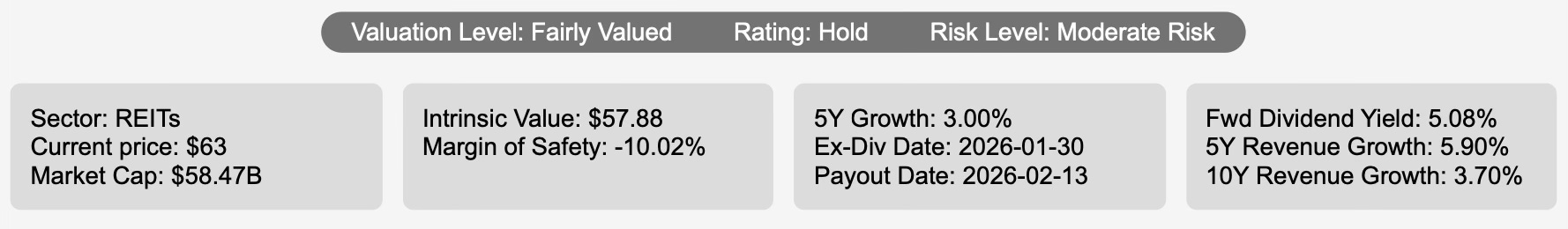 At roughly $63 compared with intrinsic value near $57.88, Realty Income trades modestly above fair value. Investors are paying a premium for predictability rather than for future expansion.