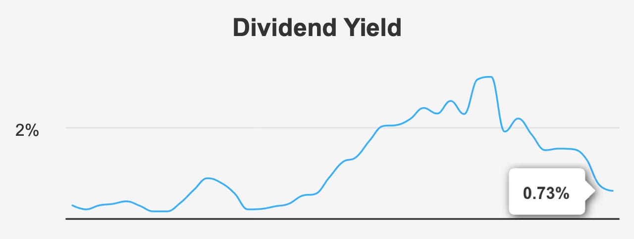 The dividend yield near a decade low also indicates investor enthusiasm has driven price ahead of income generation capacity.