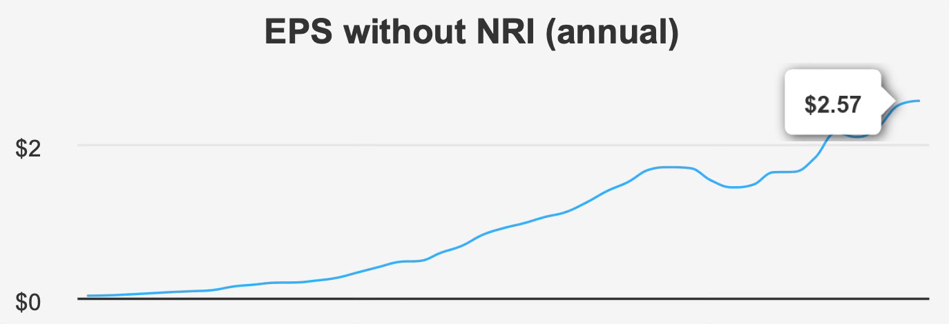 Over longer periods, the trend becomes clearer. Adjusted EPS has compounded at 7.9% annually over five years and 5.1% over ten years — respectable growth for a retailer of its scale but far from the growth profile implied by premium multiples.