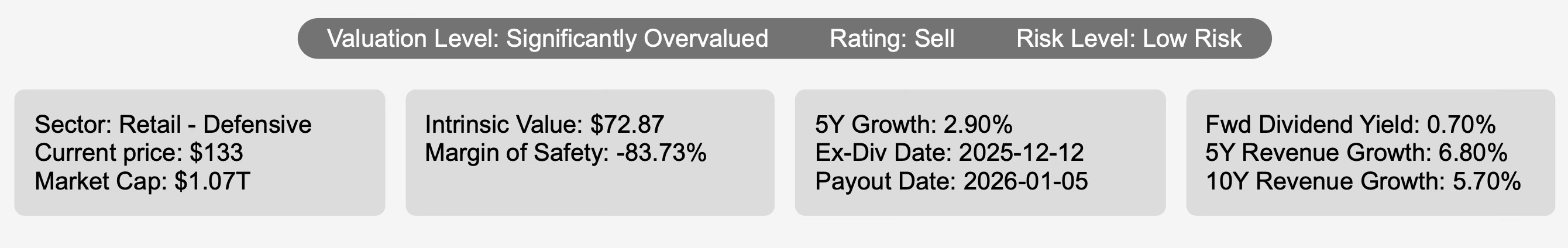 The valuation picture is stark. Walmart trades near $133 compared with an intrinsic value estimate of $72.87, implying an 83.7% negative margin of safety.